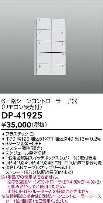 - 注)単体では使用できません。必ず6回路シーンコントローラー(DP-41924)と組み合わせてご使用ください。市販のHUB/ルーターとの接続はできません。
