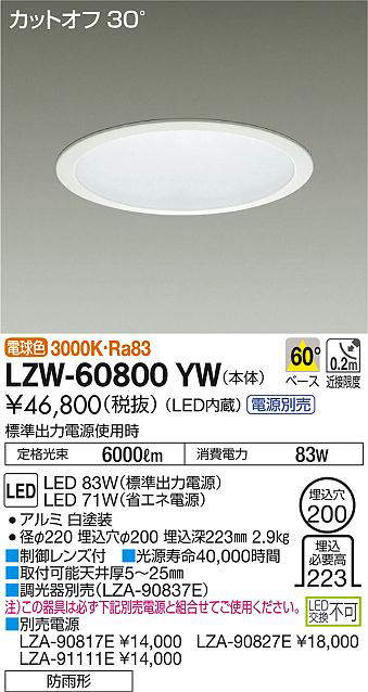 - LZW-60800YW+LZA-91111E 本体+非調光用電源(省エネ電源) 60800