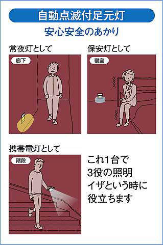 - ■非常時は携帯電灯としてコンセントから取外して使用可能。※約20時間以上連続点灯(指定電池の場合)