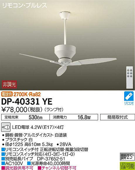 - DP-40331YE+DP-37651 LED付シーリングファン 白+シーリングファン吊りパイプ 600mm 白 81000