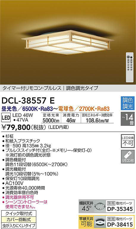 - ■プルレススイッチ付(全灯-※メモリー-保安灯-0)★※消灯前の調色調光状態■調色機能付★調色11段切替(6500K~2700K)■調光機能付★調光10段切替(5%~100%)■AC100V■シーンコントローラーは使用できません。■光源寿命40,000時間∀§■消費効率昼白色時■調光器併用不可■保安灯10段階調光§■別売 DP-35345使用時傾斜天井使用可能(45°まで)■別売 DP-38415使用時竿縁天井使用可能