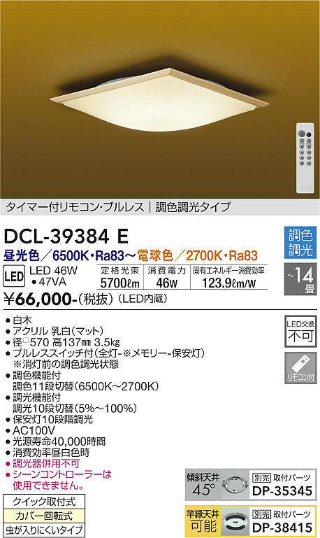 - ■プルレススイッチ付(全灯-※メモリー-保安灯)★※消灯前の調色調光状態■調色機能付★調色11段切替(6500K~2700K)■調光機能付★調光10段切替(5%~100%)■AC100V■保安灯10段階調光■光源寿命40,000時間∀§■消費効率昼白色時■調光器併用不可■シーンコントローラーは使用できません。§■別売 DP-35345使用時傾斜天井使用可能(45°まで)■別売 DP-38415使用時竿縁天井使用可能