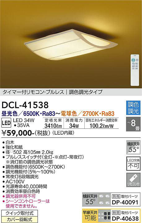 - ■プルレススイッチ付(全灯-※点灯-常夜灯)★※消灯前の調色調光状態■調色機能付★(6500K~2700K)■調光機能付★(5%~100%)■AC100V∀§■常夜灯6段階調光§■別売 DP-40091使用時傾斜天井使用可能(55°まで)■光源寿命40,000時間∀§■消費効率昼白色時■調光器併用不可■シーンコントローラーは使用できません。■傾斜天井にも使用可能(55°まで)§■別売 DP-40638使用時竿縁天井使用可能